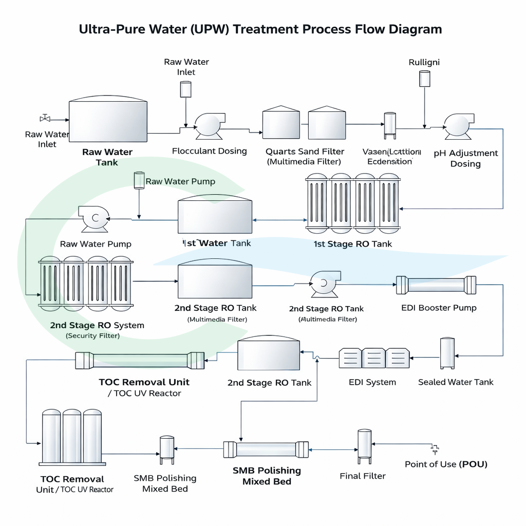 • Process Flow: Quartz Sand Filter → Activated Carbon Filter → Stage 1 Reverse Osmosis → Stage 2 Reverse Osmosis → EDI System → Polishing Mixed Bed System → UPW